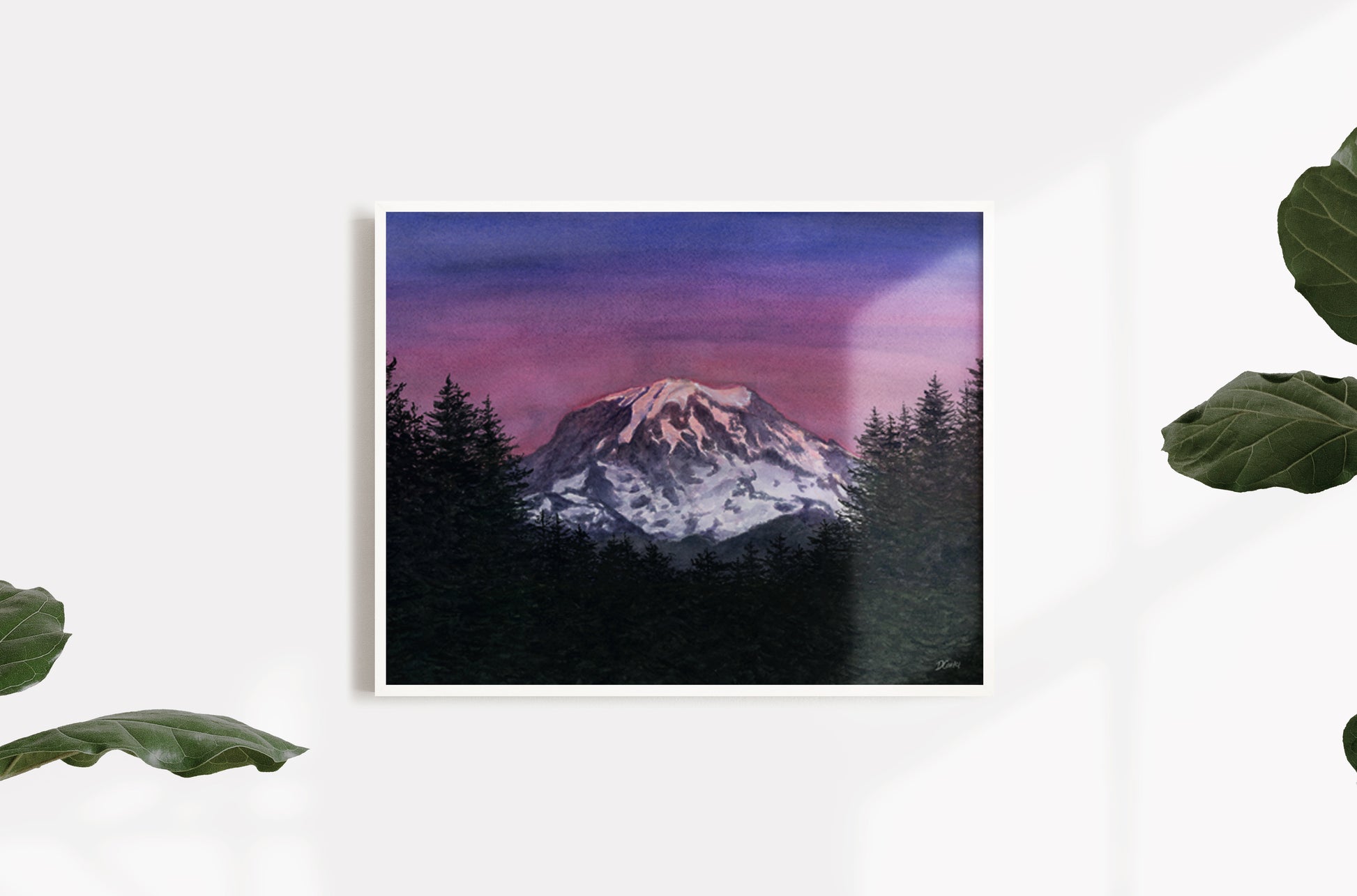 Bring the serene beauty of the mountains into your space with "Twilight Hope", a captivating watercolor painting that captures the quiet majesty of a snow-covered peak at dusk. Set against a dreamy gradient sky, the mountain rises in peaceful solitude above a silhouette of evergreen trees, evoking both awe and tranquility.